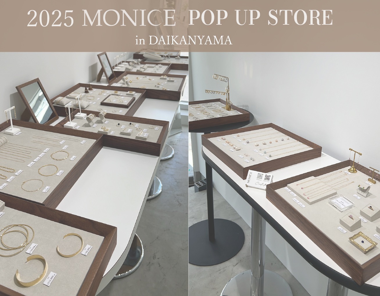 - 2025 MONICE POP UP STORE - 昨年2025年7月、MONICEでは初となるPOP UPイベントを開催いたしました。 会期中は多くの皆さまにご来場いただき、私たちにとっても忘れがたい、かけがえのない時間となりました。 そしてこのたび、昨年と同じ会場にて、再び開催する運びとなりました。 東京都・代官山の静かな空間の中で、一人ひとりのお客さまとジュエリーを囲みながら、ゆっくりと言葉を交わせるひとときを大切にしたいと考えております。 また皆さまとお目にかかれる日を、心より楽しみにしております。 ▶ POP UP STORE ご予約・開催概要はこちら