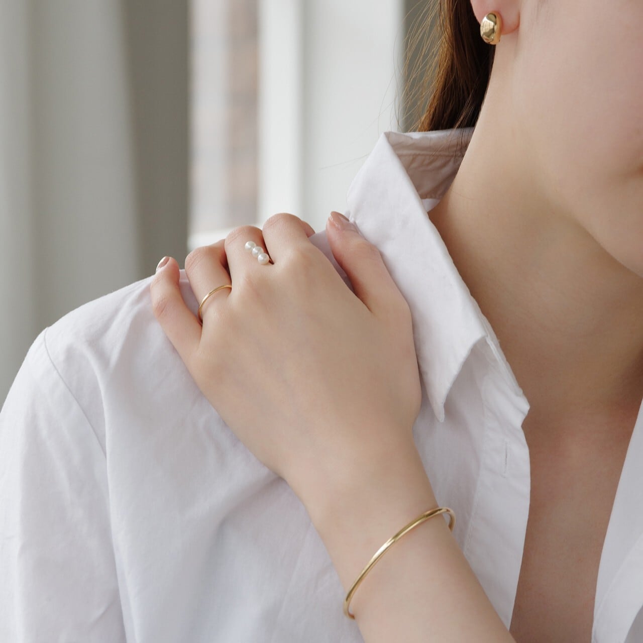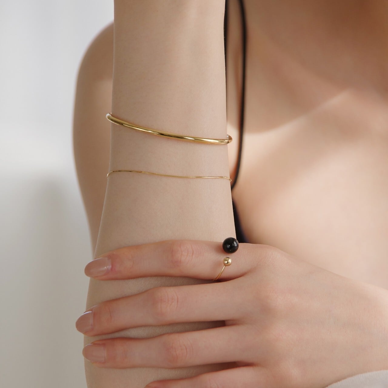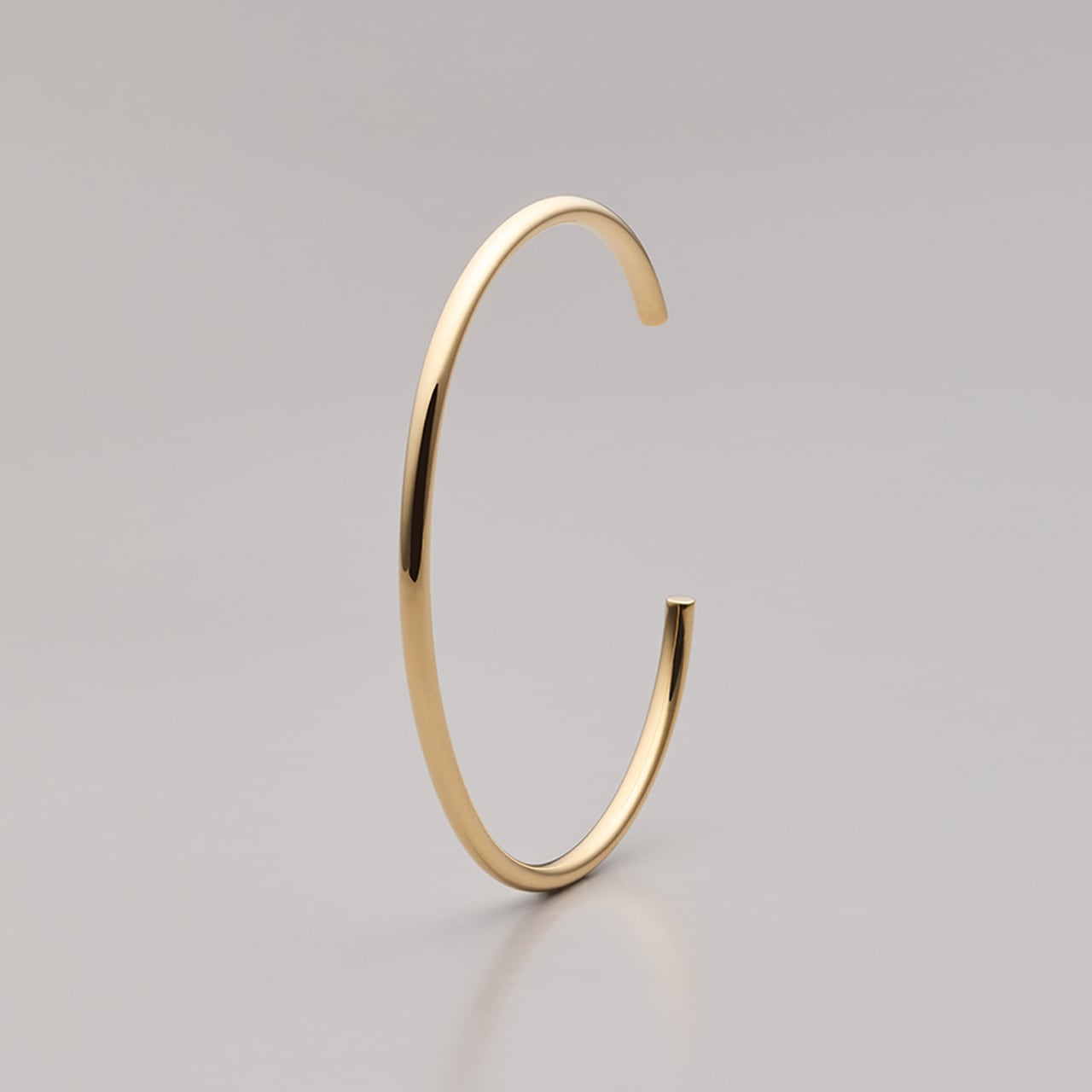 腕の形状に合わせ職人がひとつひとつ作り上げたフォルムは、手首をそっと包み込みます。バングルは、程よいボリューム感で、シンプルなデザインが魅力のひとつ。カジュアルにもフォーマルにも合うメタリックな質感が、大人のシャープな美しさを演出します。