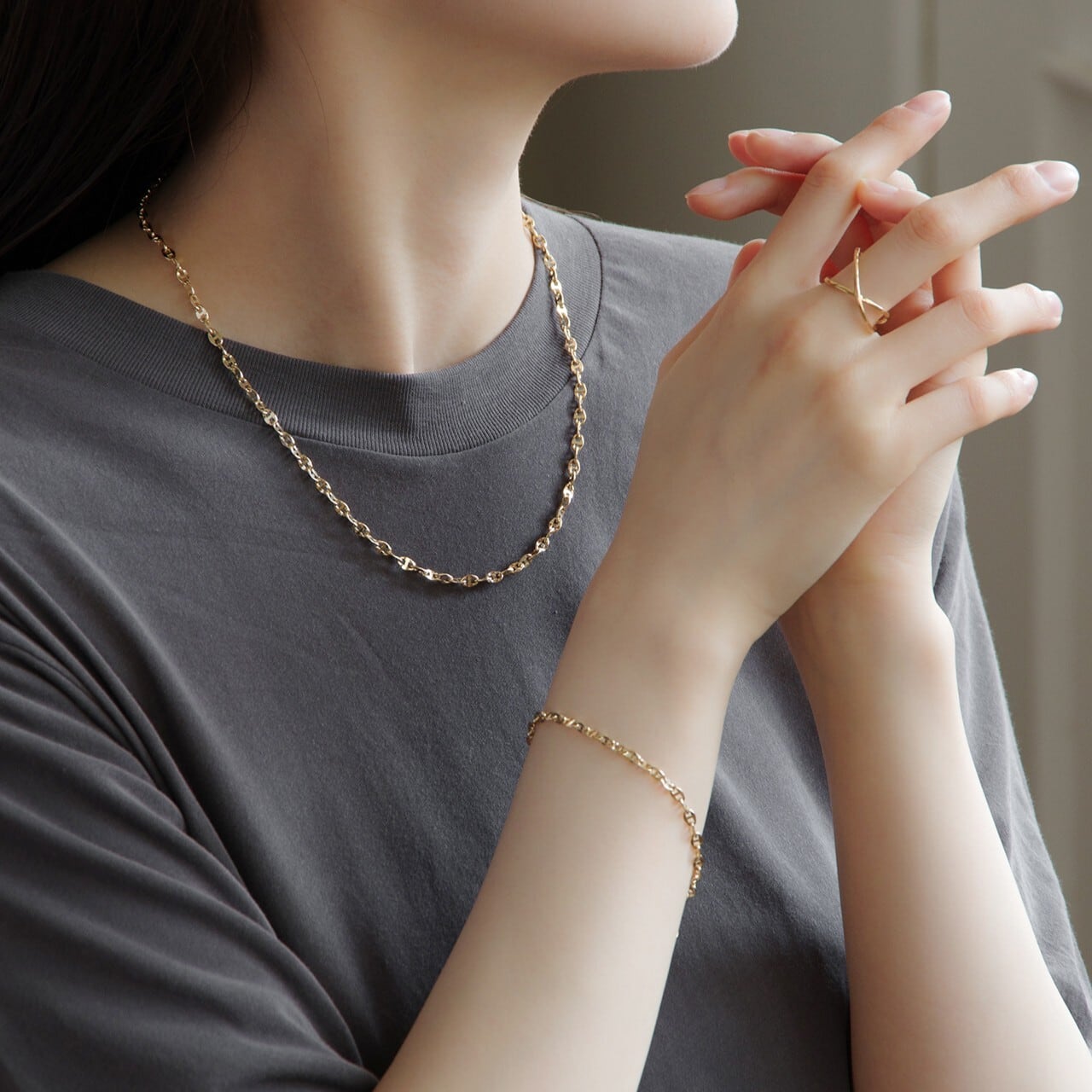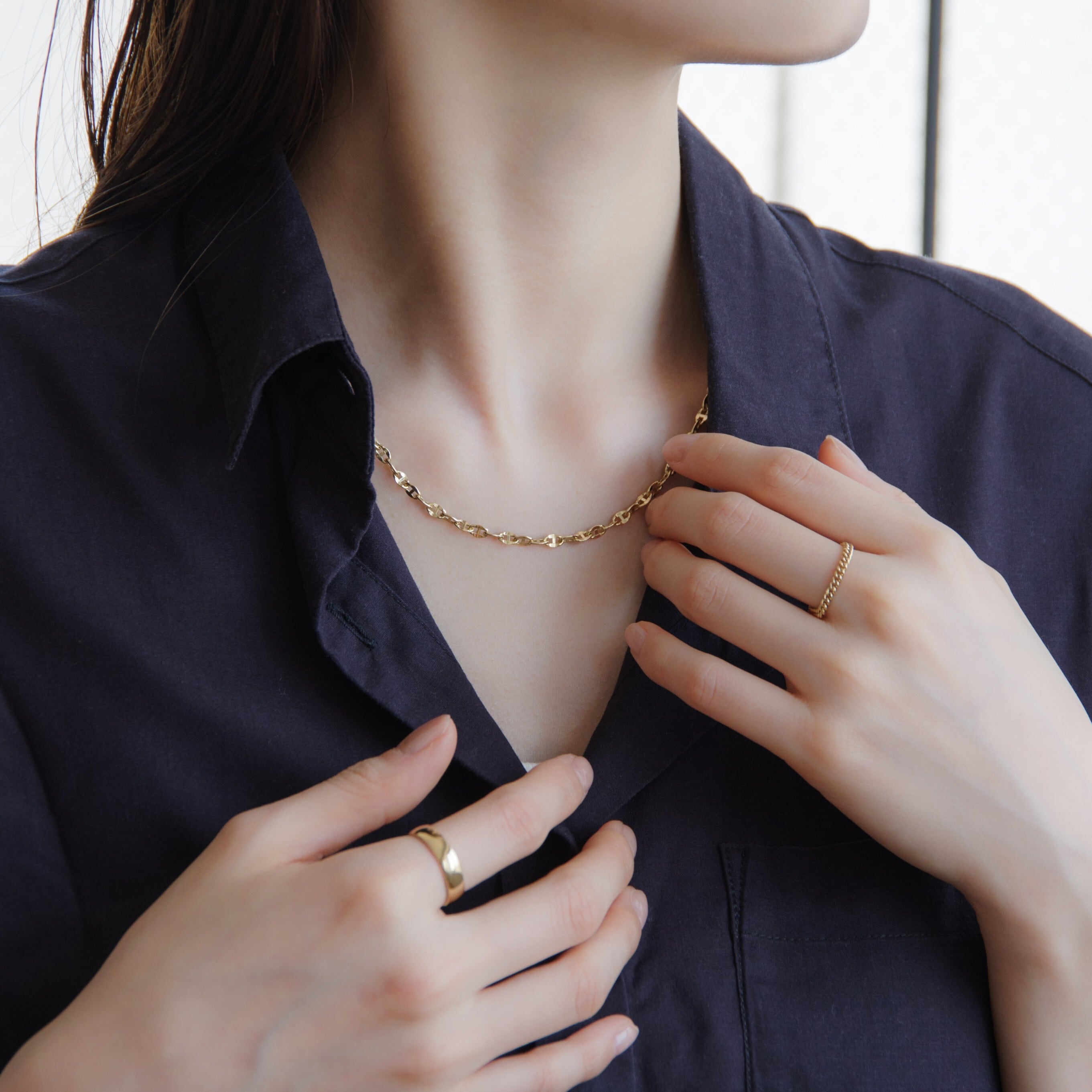 上品な輝きと程よいボリューム感が魅力の、K18YGアンカーチェーンネックレス。