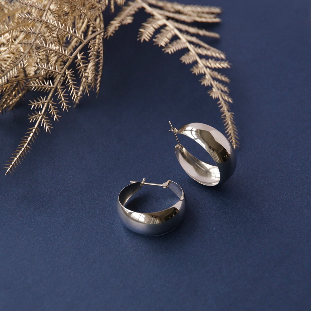 25mmサイズは、程よいサイズ感で、上品な着こなしに。身に着けるだけでコーディネートの主役となるおすすめのアイテムです。