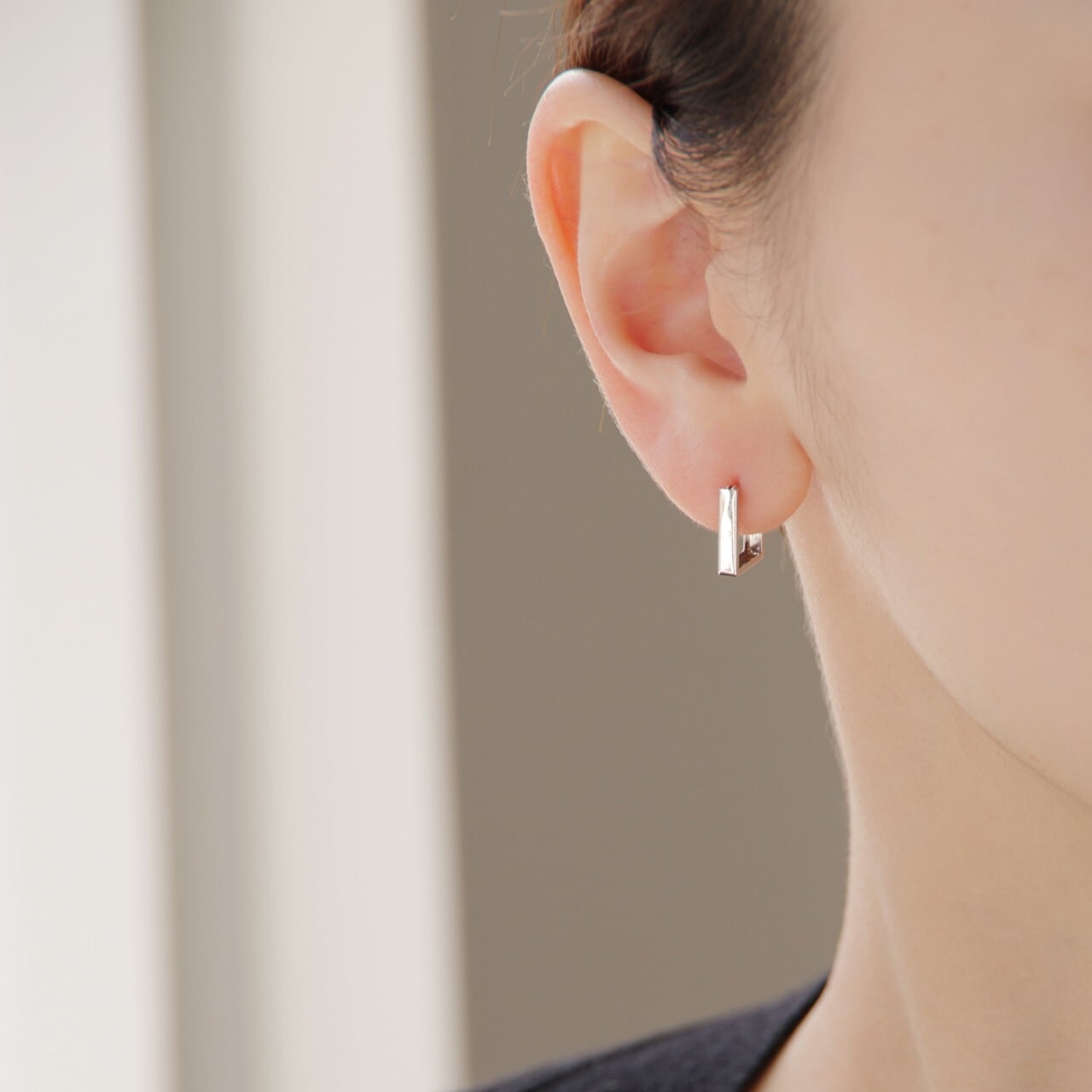 モダンな雰囲気を感じさせる、K18WGのレクタングルフープピアス。建築や構造物でも多く使用される長方形。見ている側に力強さや信頼感を与え、無駄のないミニマムさが性別を問わず愛されています。軽やかな着け心地と、エッジの効いた美しいフォルムは、独自の技術によって生み出されたもの。洗練されたスタイリッシュなデザインは、クールでマニッシュな印象を与えてくれます。キャッチレスで着脱も簡単のため、デイリーにお楽しみいただけます。