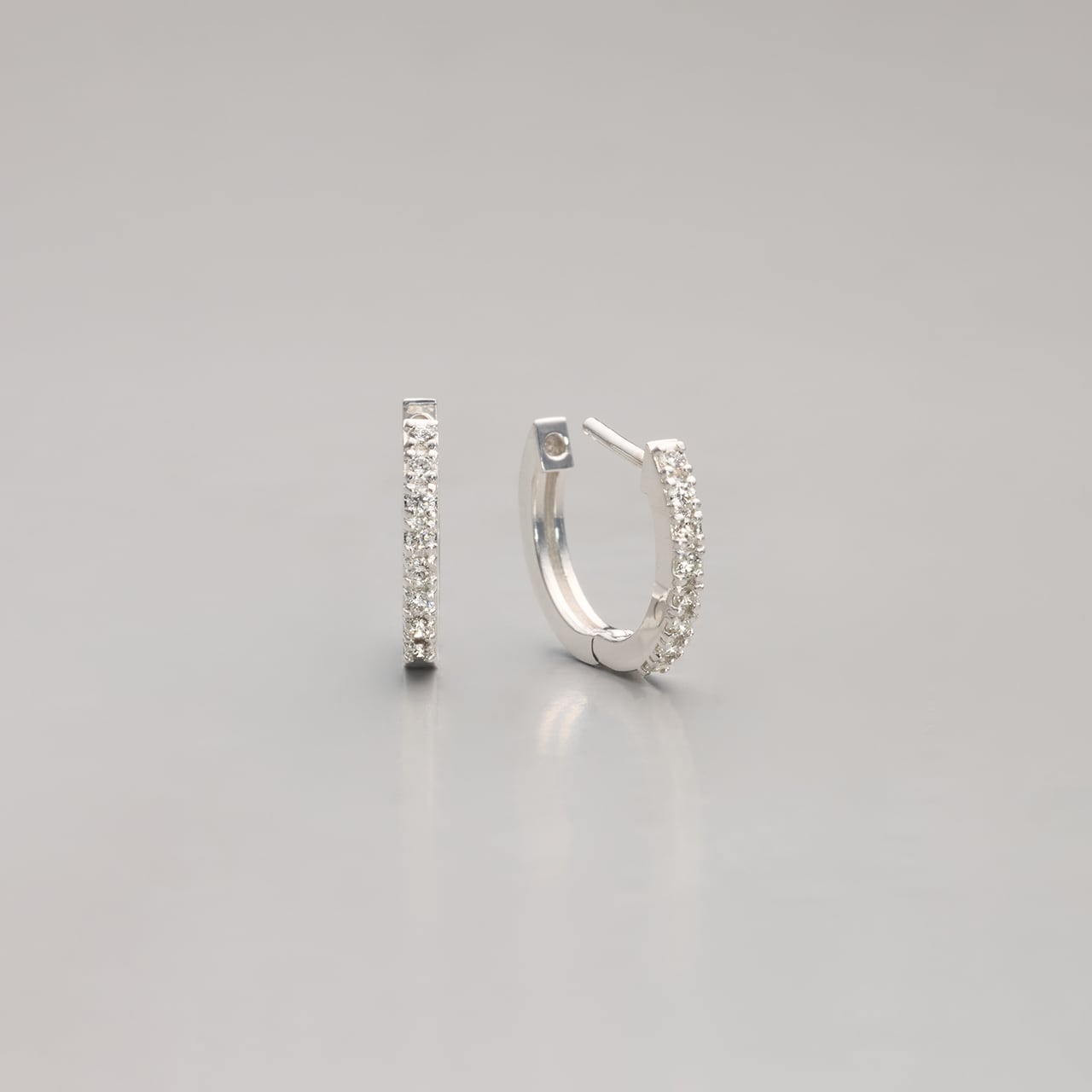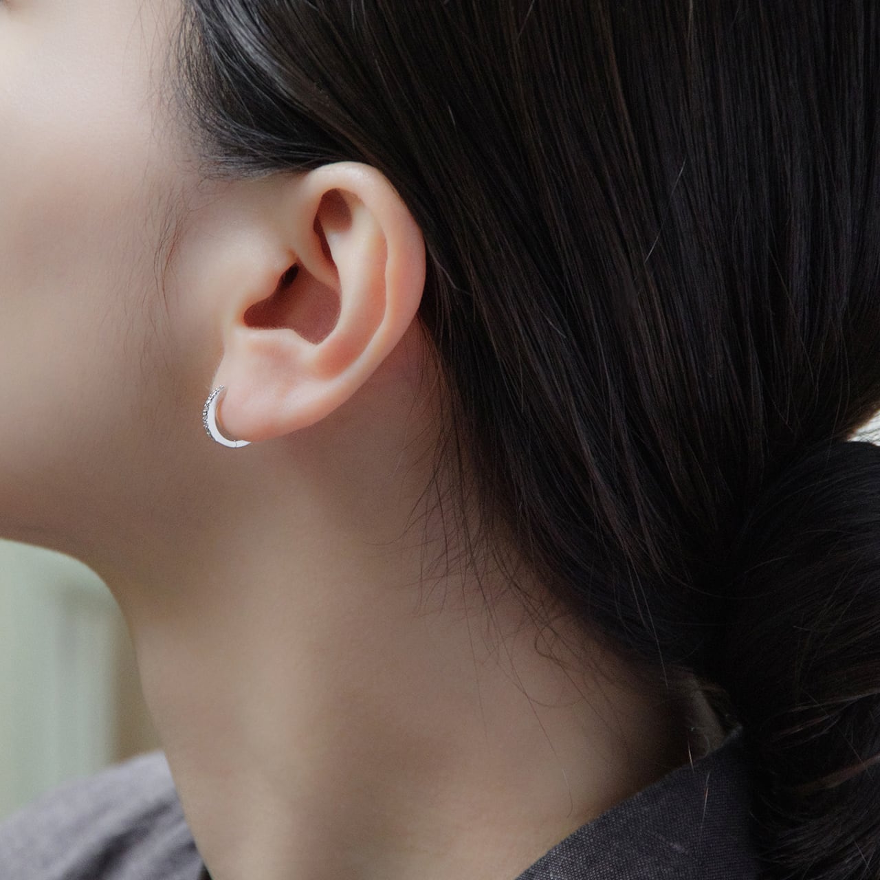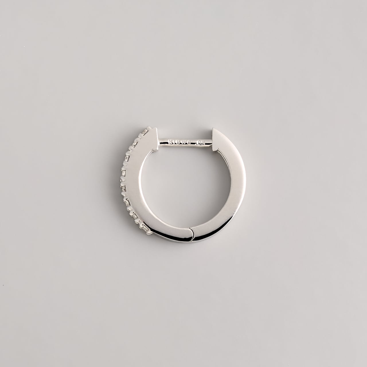 繊細に並ぶメレダイヤが凛とした輝きを添える、K18WGのベーシックフープピアス。一粒一粒、職人の手で丁寧に留められたダイヤモンドが、さりげなくも確かな存在感を放ち、耳元に上品なきらめきを添えます。K18WGのクールで清らかな光沢は、ダイヤモンドの透明感を一層引き立て、モダンで洗練された印象に。直径12mmは普段使いしやすく、シーンレスで楽しめます。キャッチレスで取り扱いしやすい仕様も魅力。知的でスタイリッシュな雰囲気を演出したい方にもおすすめです。