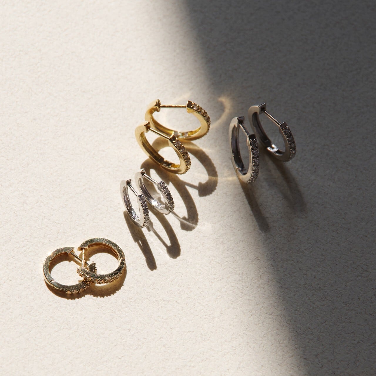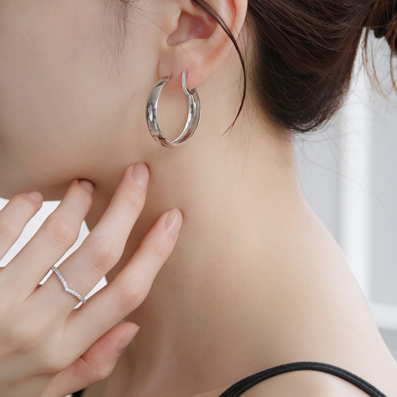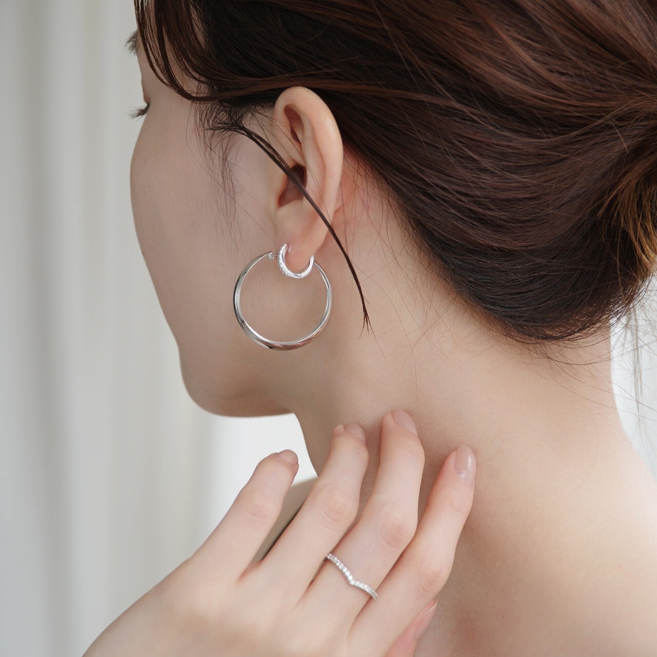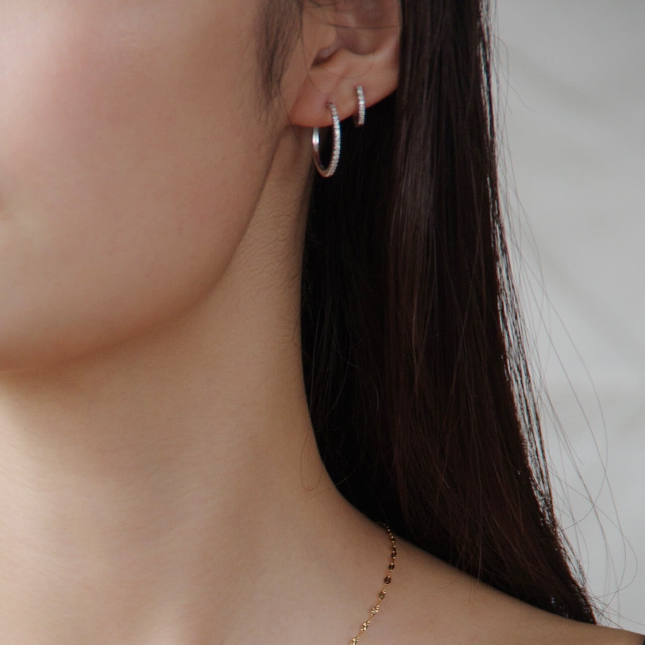 繊細に並ぶメレダイヤが凛とした輝きを添える、K18WGのベーシックフープピアス。一粒一粒、職人の手で丁寧に留められたダイヤモンドが、さりげなくも確かな存在感を放ち、耳元に上品なきらめきを添えます。K18WGのクールで清らかな光沢は、ダイヤモンドの透明感を一層引き立て、モダンで洗練された印象に。直径12mmは普段使いしやすく、シーンレスで楽しめます。キャッチレスで取り扱いしやすい仕様も魅力。知的でスタイリッシュな雰囲気を演出したい方にもおすすめです。