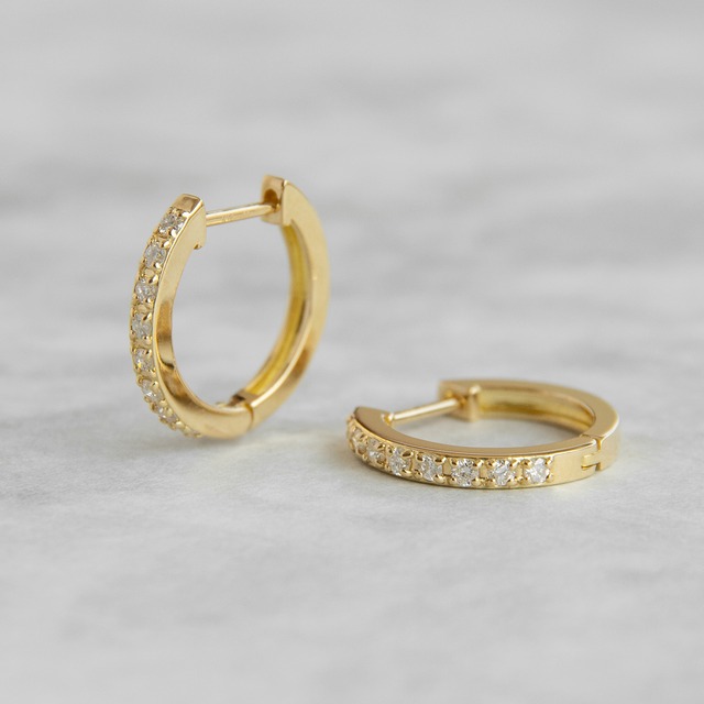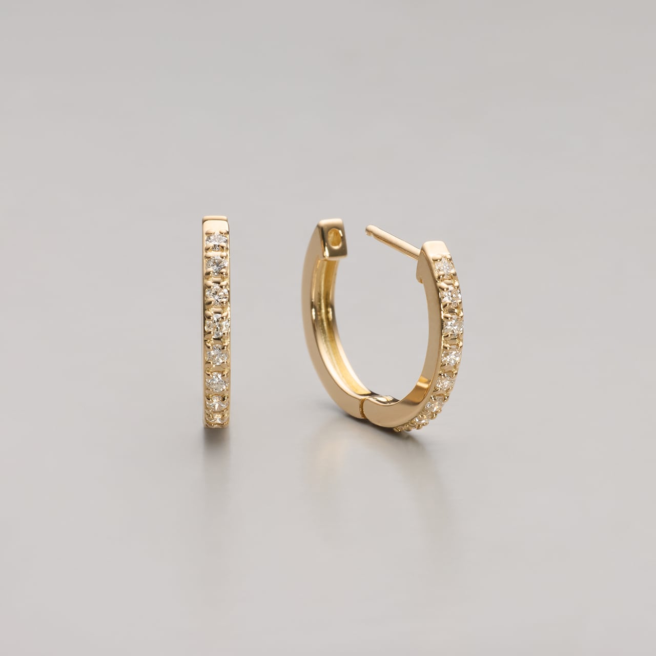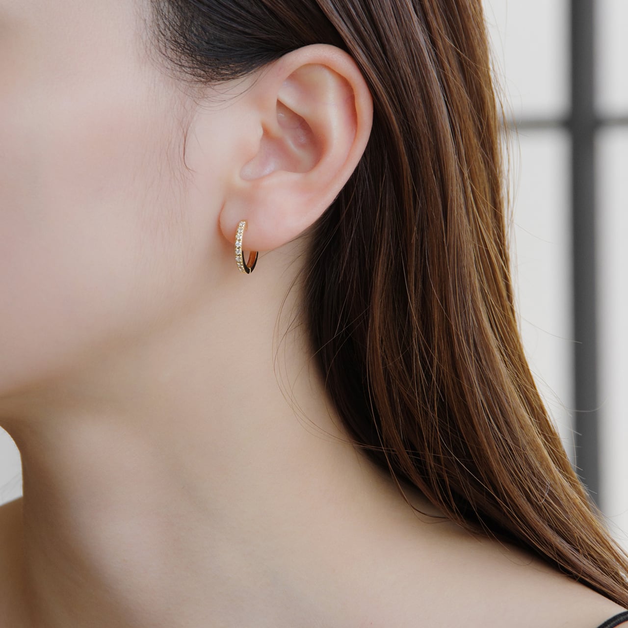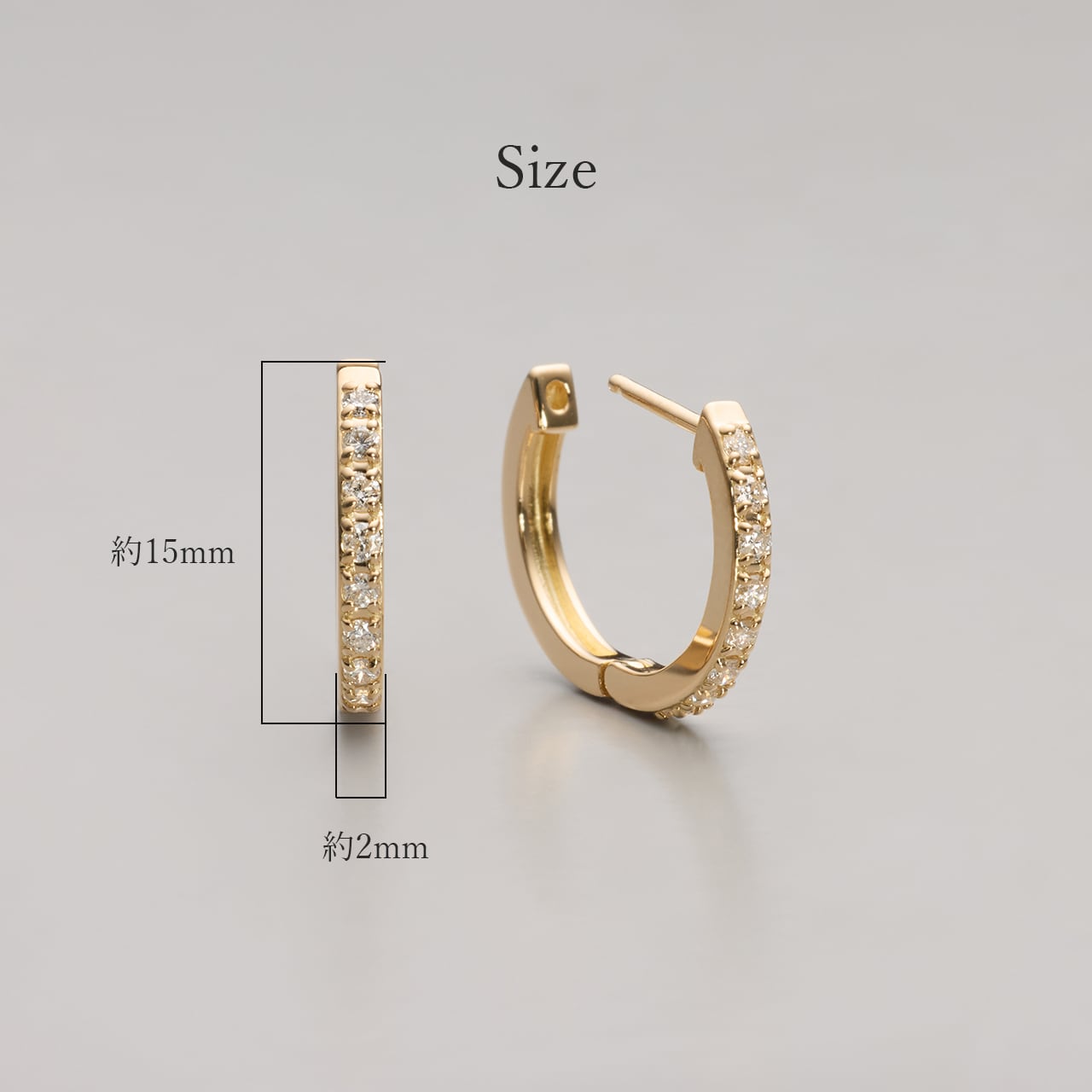 大人の女性に欠かせない、永遠の定番ダイヤモンドフープピアス。直径15mmのミディアムサイズで、耳元にほどよい存在感を添えながらも、シーンを選ばず活躍します。前面には縦ラインに沿ってメレダイヤを丁寧に敷き詰め、洗練された高級感をプラス。