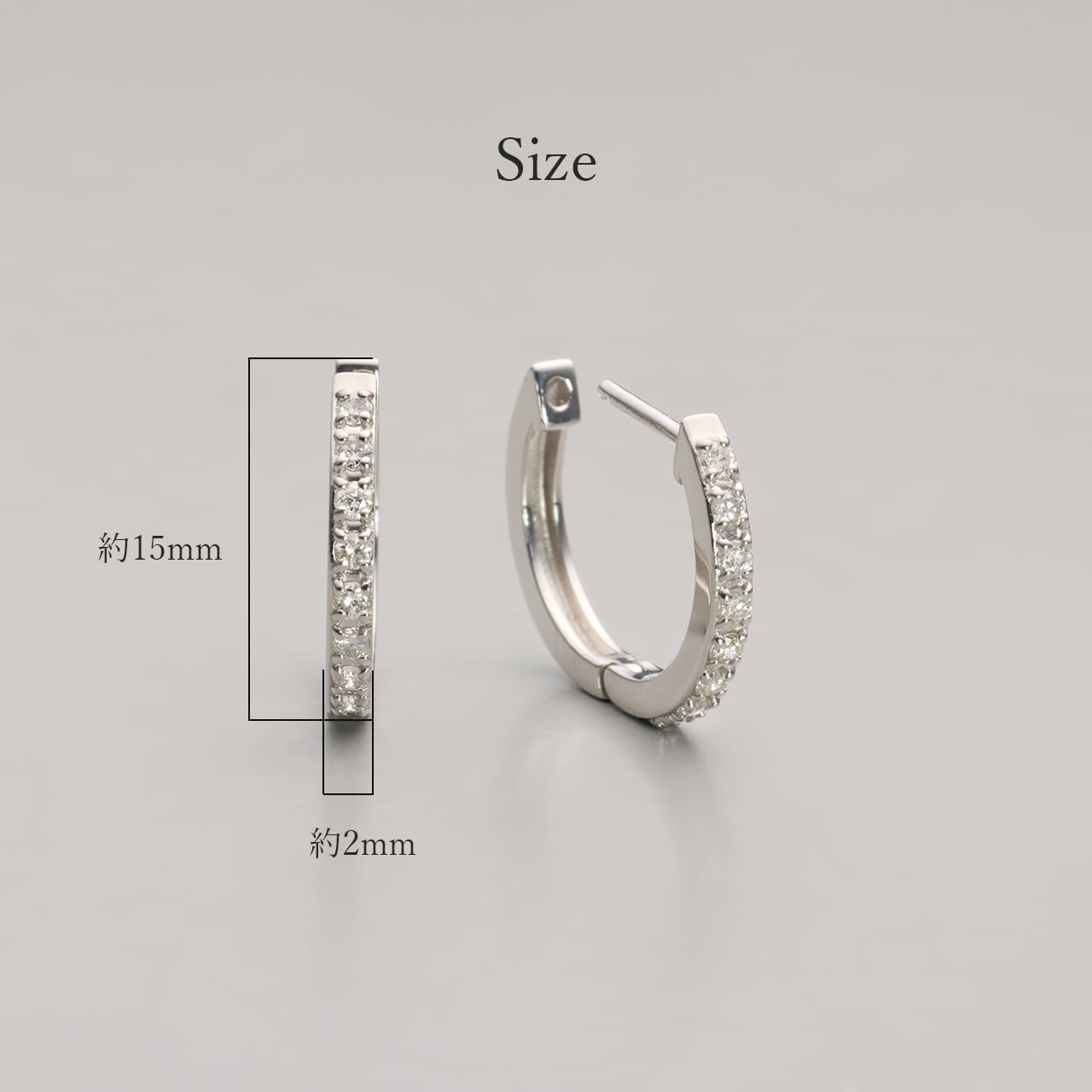 大人の女性に欠かせない、永遠の定番フープピアス。直径15mmのミディアムサイズで、耳元にほどよい存在感を添えながらも、シーンを選ばず活躍します。前面には縦ラインに沿ってメレダイヤを丁寧に敷き詰め、洗練された高級感をプラス。