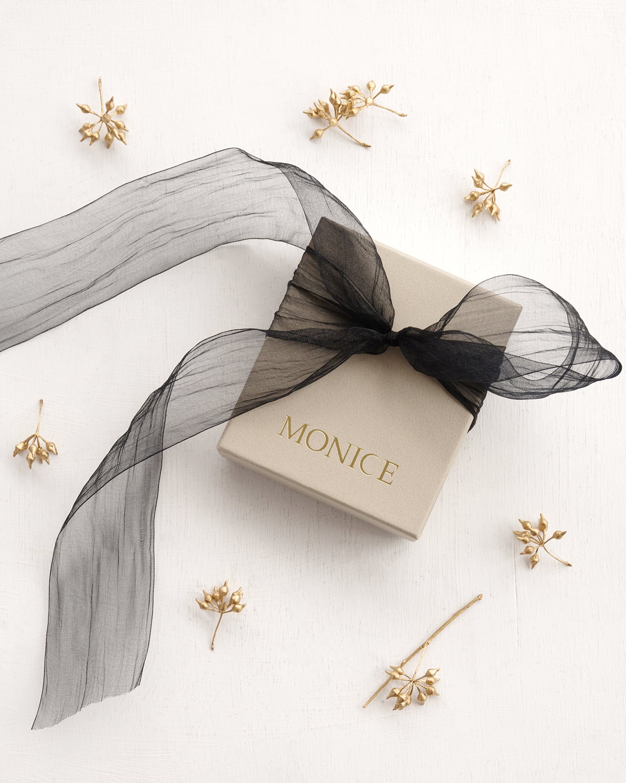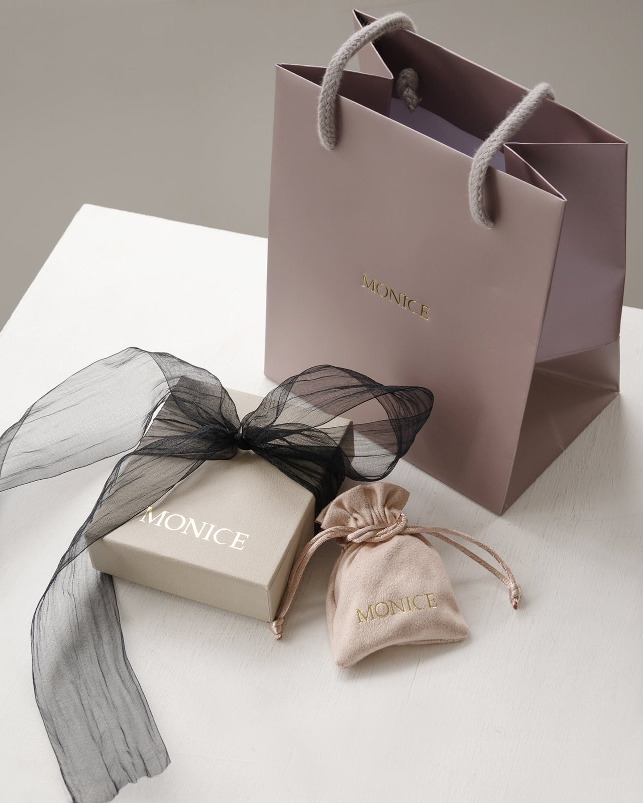 ジュエリーは巾着ポーチとケースにお入れし、透け感のある黒のオーガンジーリボンを片結びでお包みします。ショッパーを添えてお届けいたします。