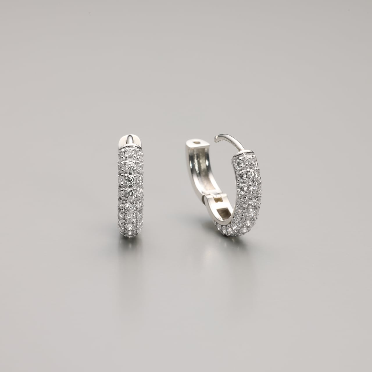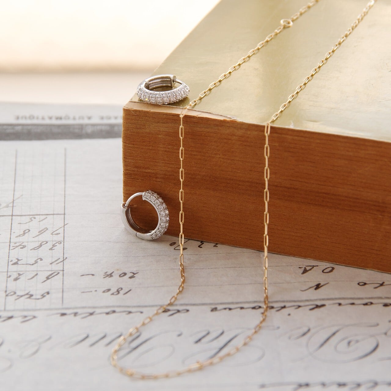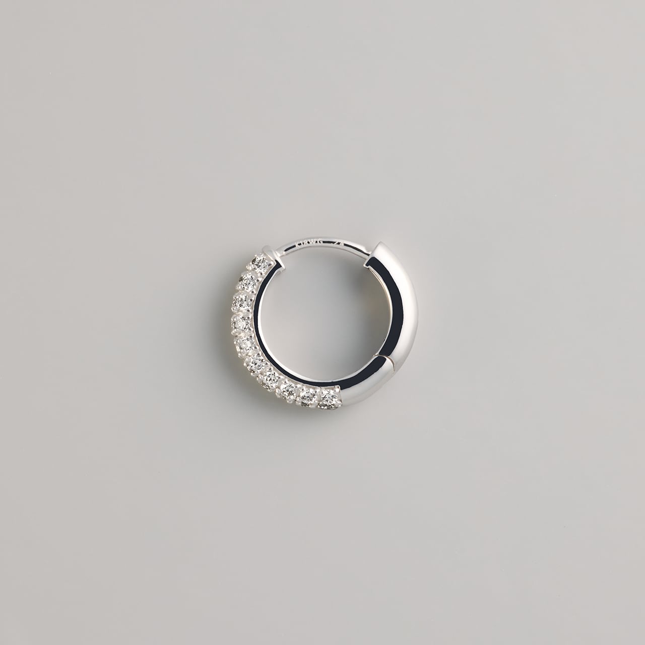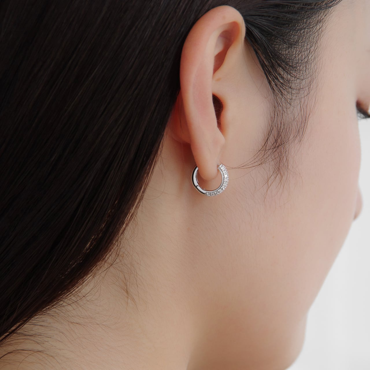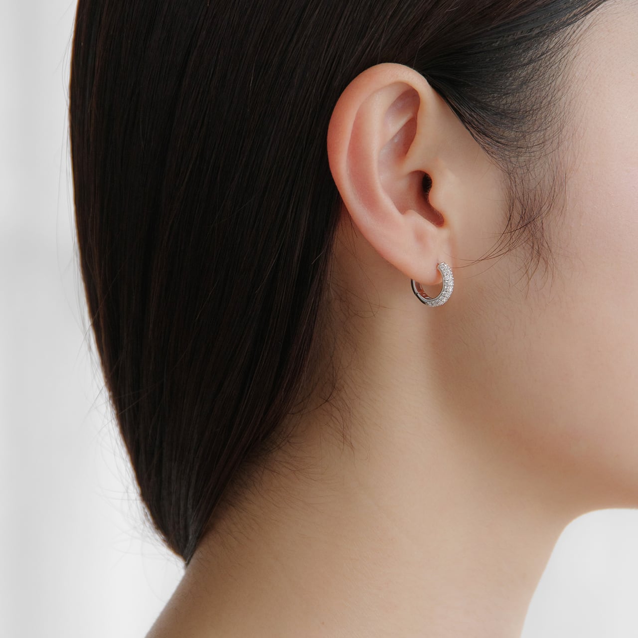 アンティークムード漂うパヴェを、ホワイトゴールドで都会的かつミニマルに再構築しました。熟練の職人が一粒ずつ角度と留め位置をミリ単位で調整。光を受けるたび透明感あふれる輝きを放ち、どの角度から見ても目を奪う美しさを叶えます。シックな装いにもカジュアルにも寄り添う万能デザインで、程よいサイズ感が耳元を上品にドレスアップ。クラシックな趣と現代的な洗練を兼ね備えた、大人のための特別な一本です。