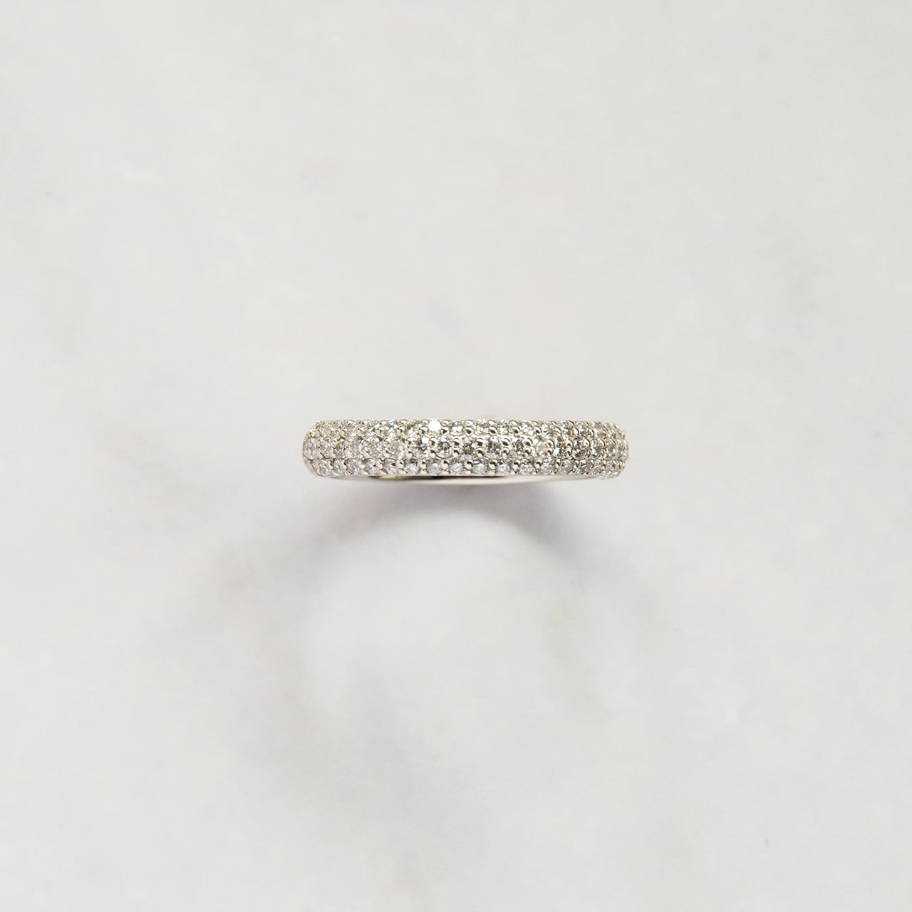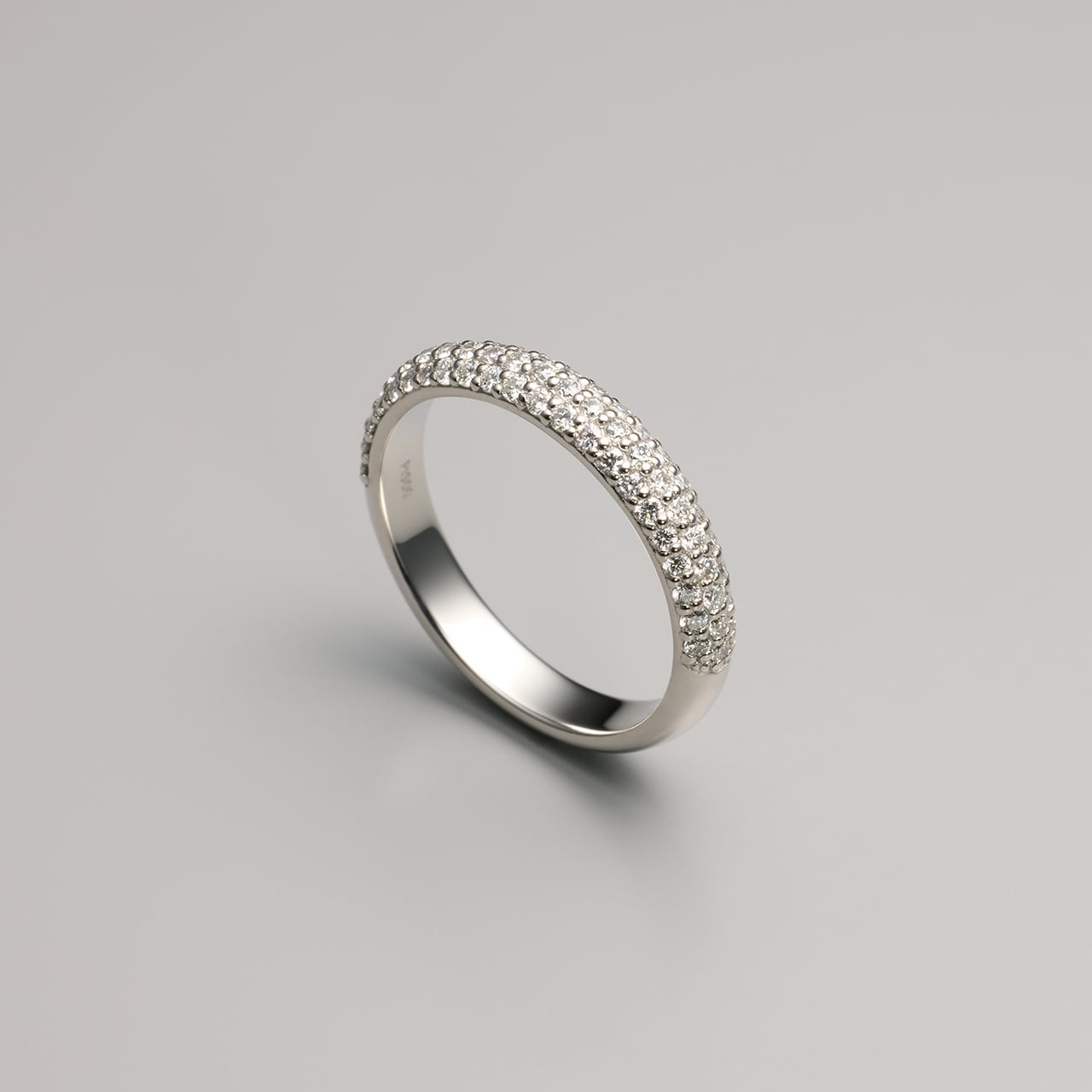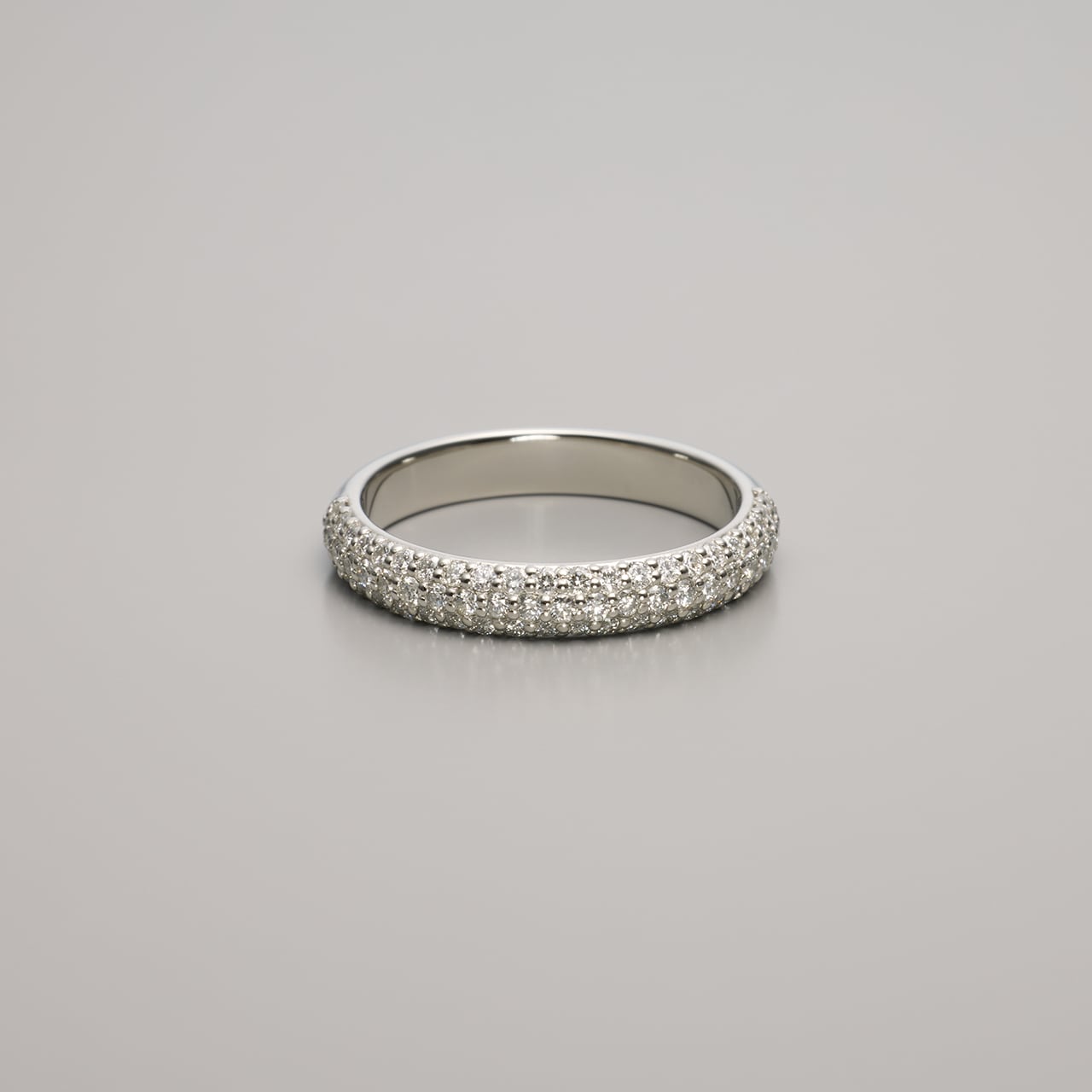 指先に67粒ものメレダイヤを贅沢に敷き詰めた、プラチナのパヴェリング。