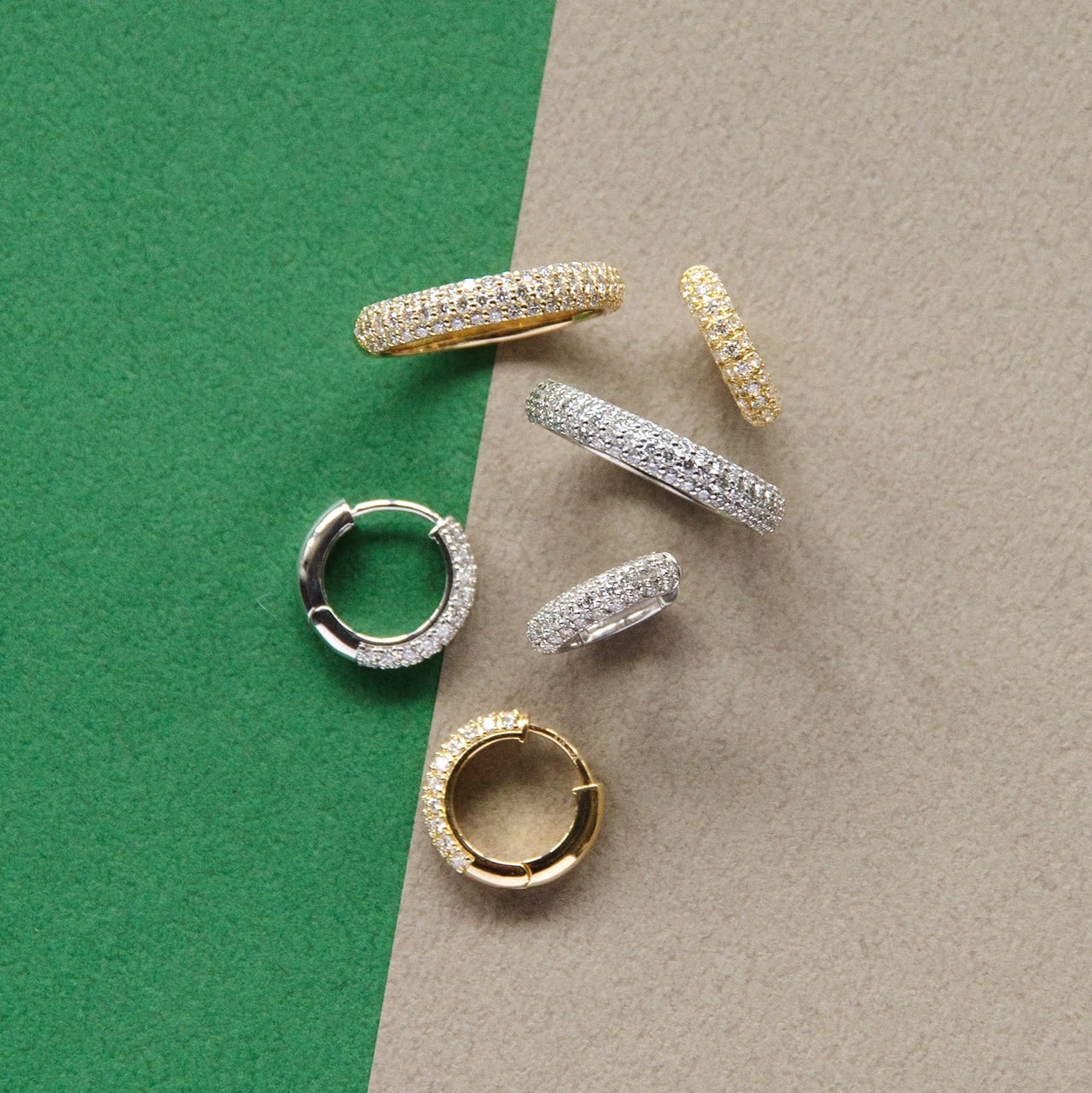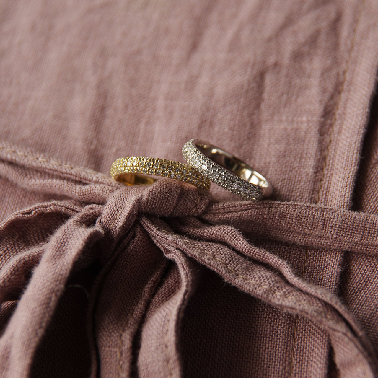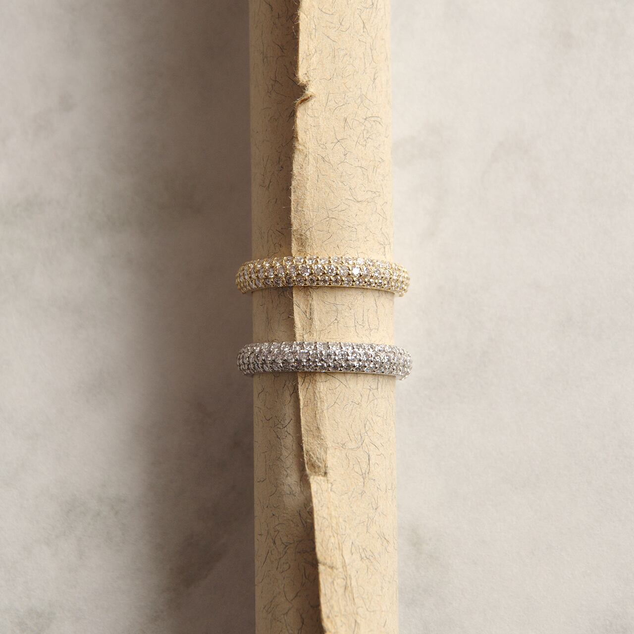 指先に67粒ものメレダイヤを贅沢に敷き詰めた、プラチナのパヴェリング。