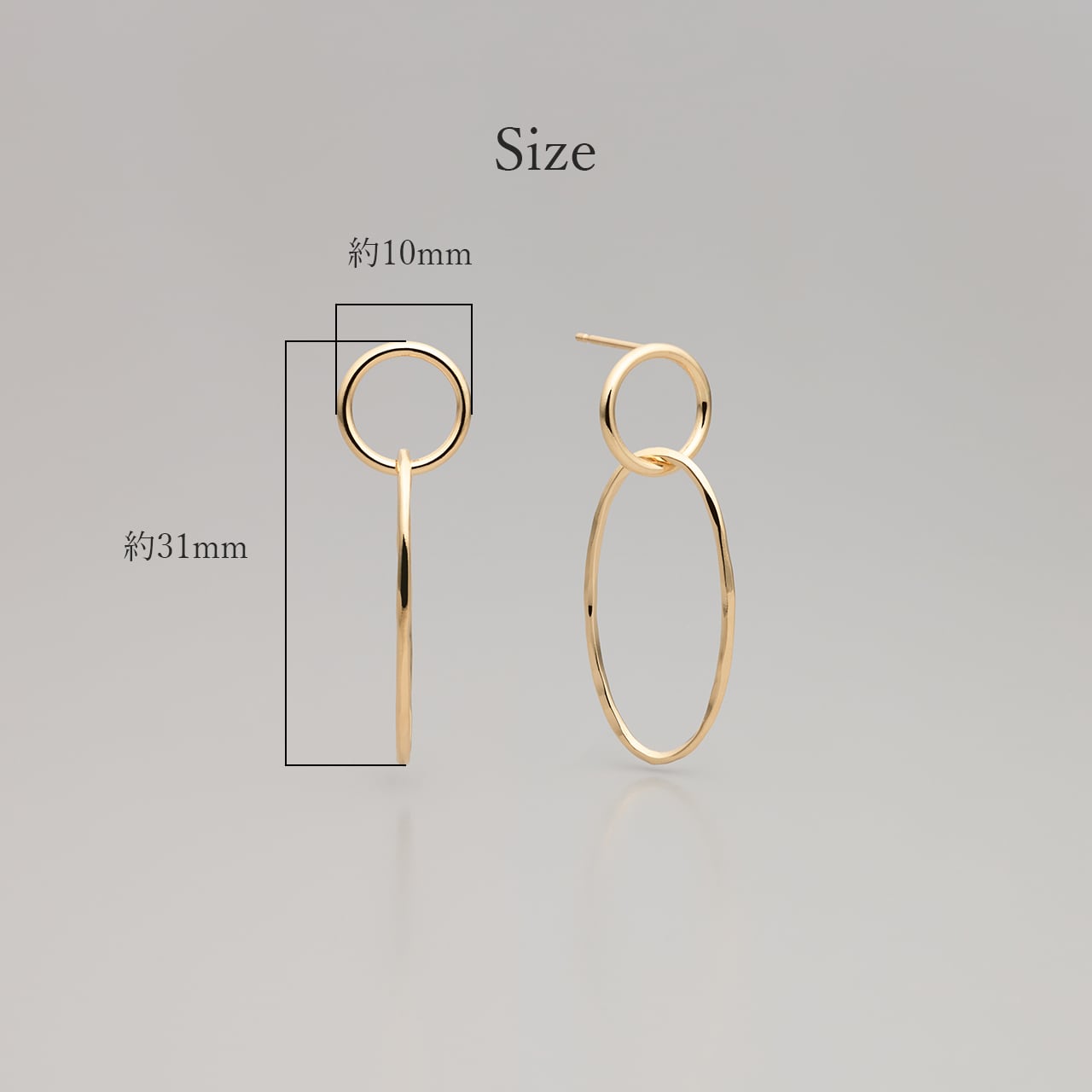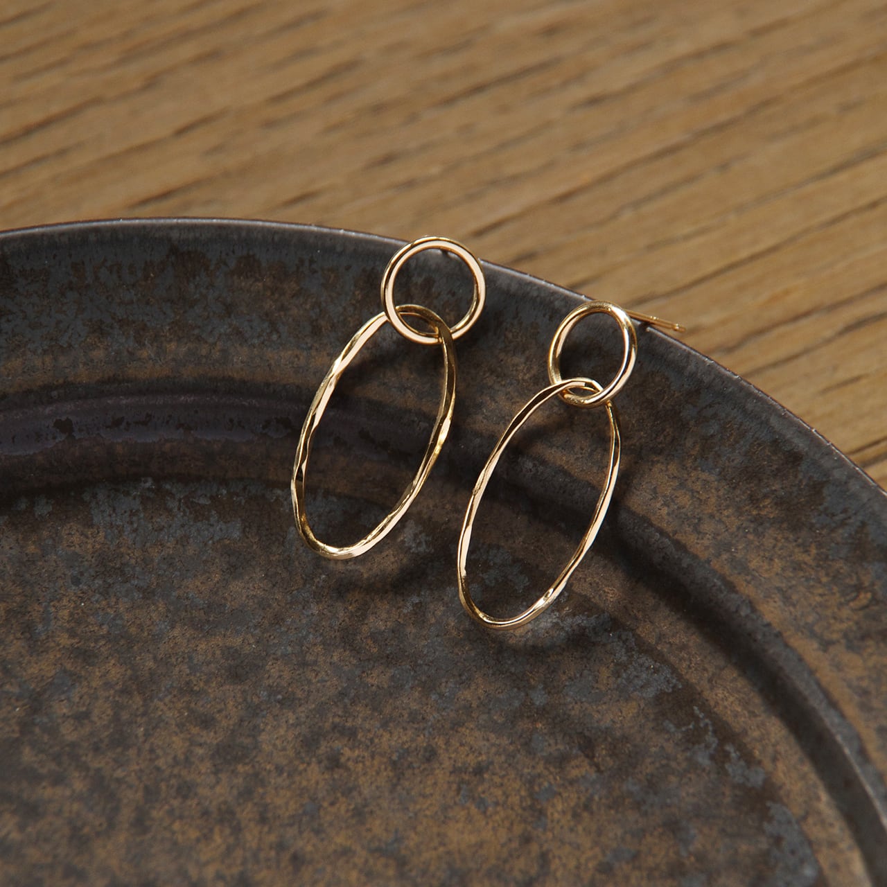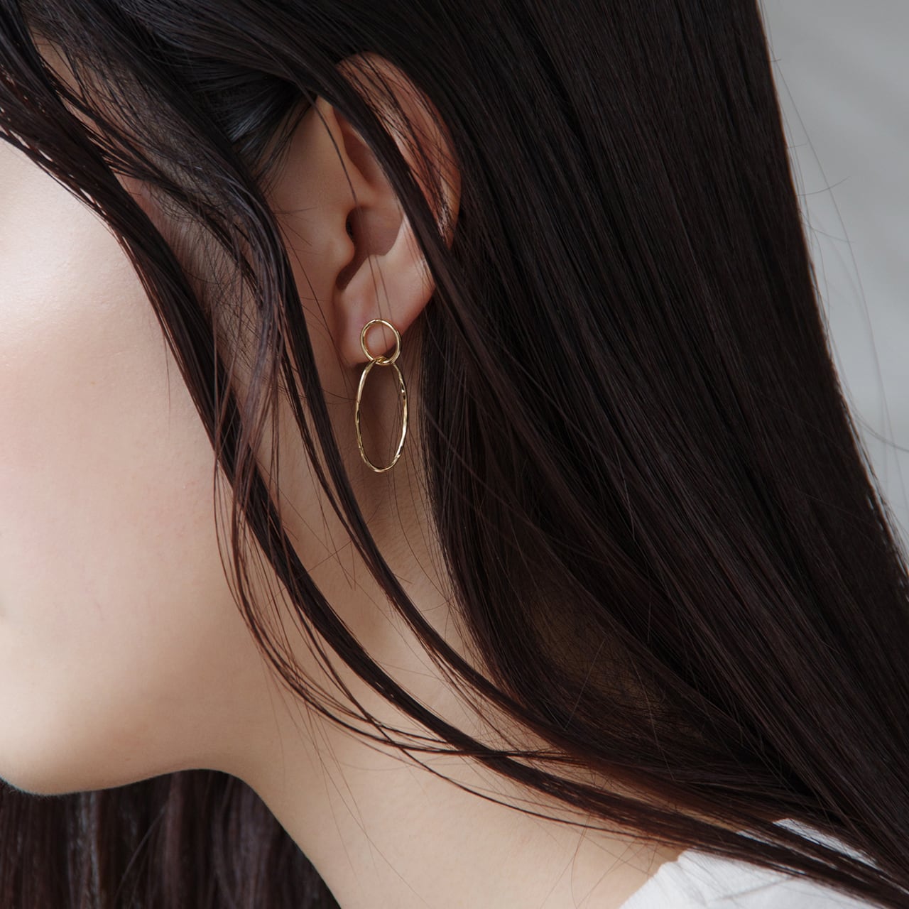 繊細な金線で描いたサークルに、オーバルフォルムのサークルを連ねた、抜け感あふれる軽やかなピアス。空気を含むようなデザインが、耳元にやさしい動きと立体感を生み出します。K18YGならではの柔らかな艶めきが肌になじみ、顔まわりを明るく上品な印象に。軽やかな着け心地で、長時間の着用も快適です。シンプルな装いに合わせるだけで、洗練された大人のニュアンスを添えてくれます。
