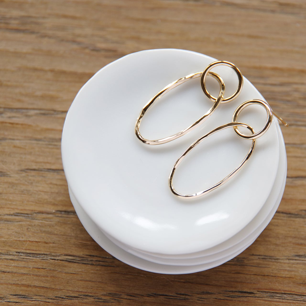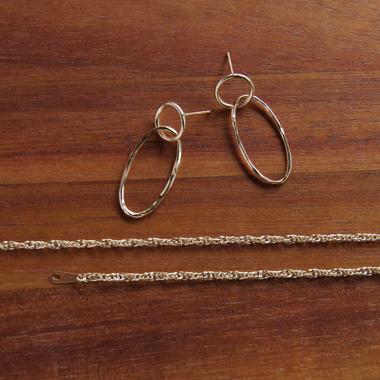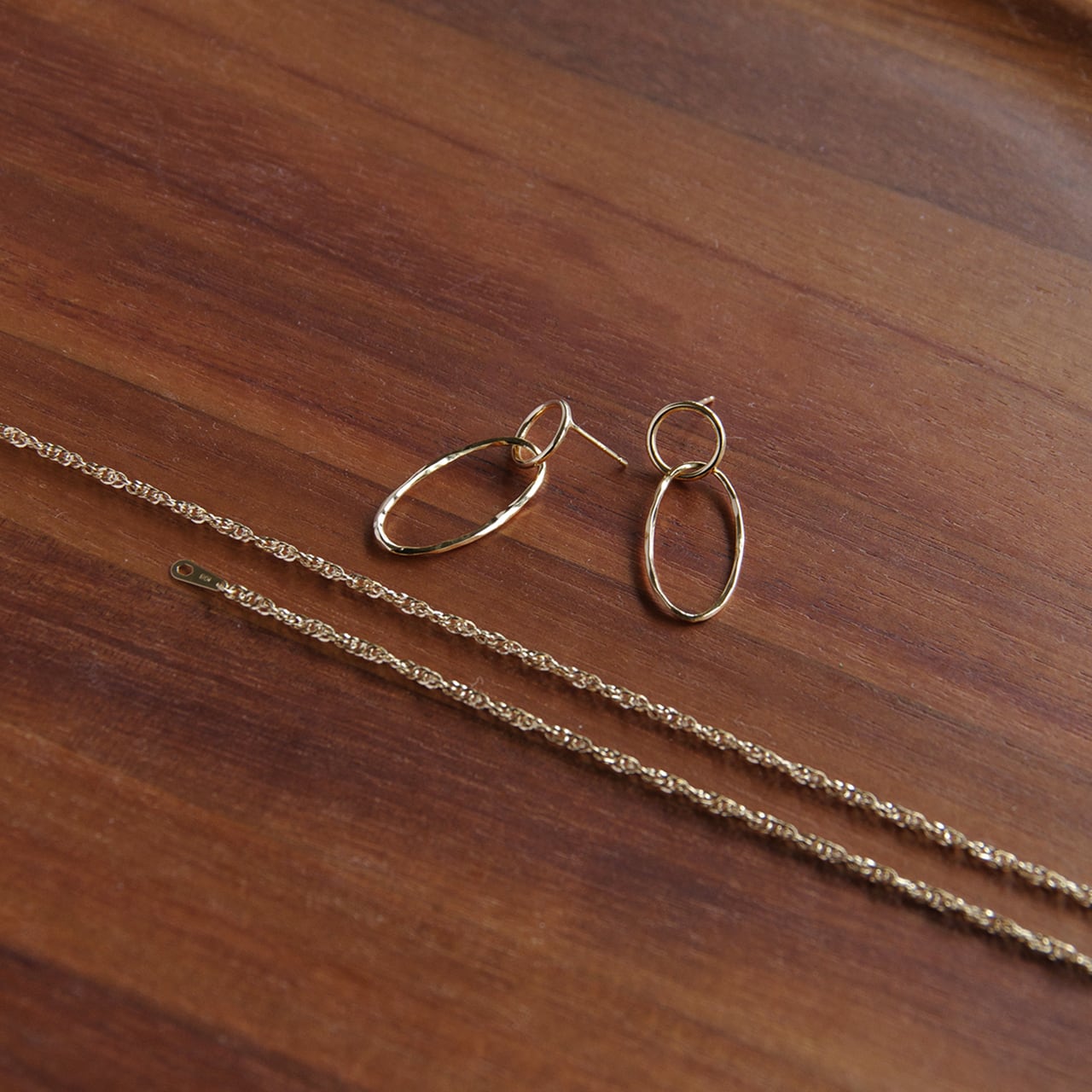 繊細な金線で描いたサークルに、オーバルフォルムのサークルを連ねた、抜け感あふれる軽やかなピアス。空気を含むようなデザインが、耳元にやさしい動きと立体感を生み出します。K18YGならではの柔らかな艶めきが肌になじみ、顔まわりを明るく上品な印象に。軽やかな着け心地で、長時間の着用も快適です。シンプルな装いに合わせるだけで、洗練された大人のニュアンスを添えてくれます。