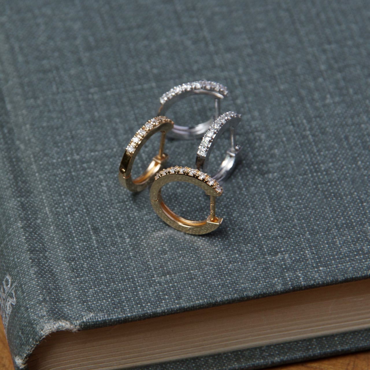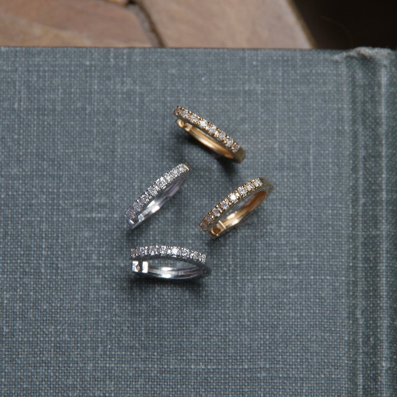 クリアな煌めきを象るメレサイズのダイヤモンドを一列に並べ、ゴールドとの一体感を生み出すように彫り留めたフープピアス。