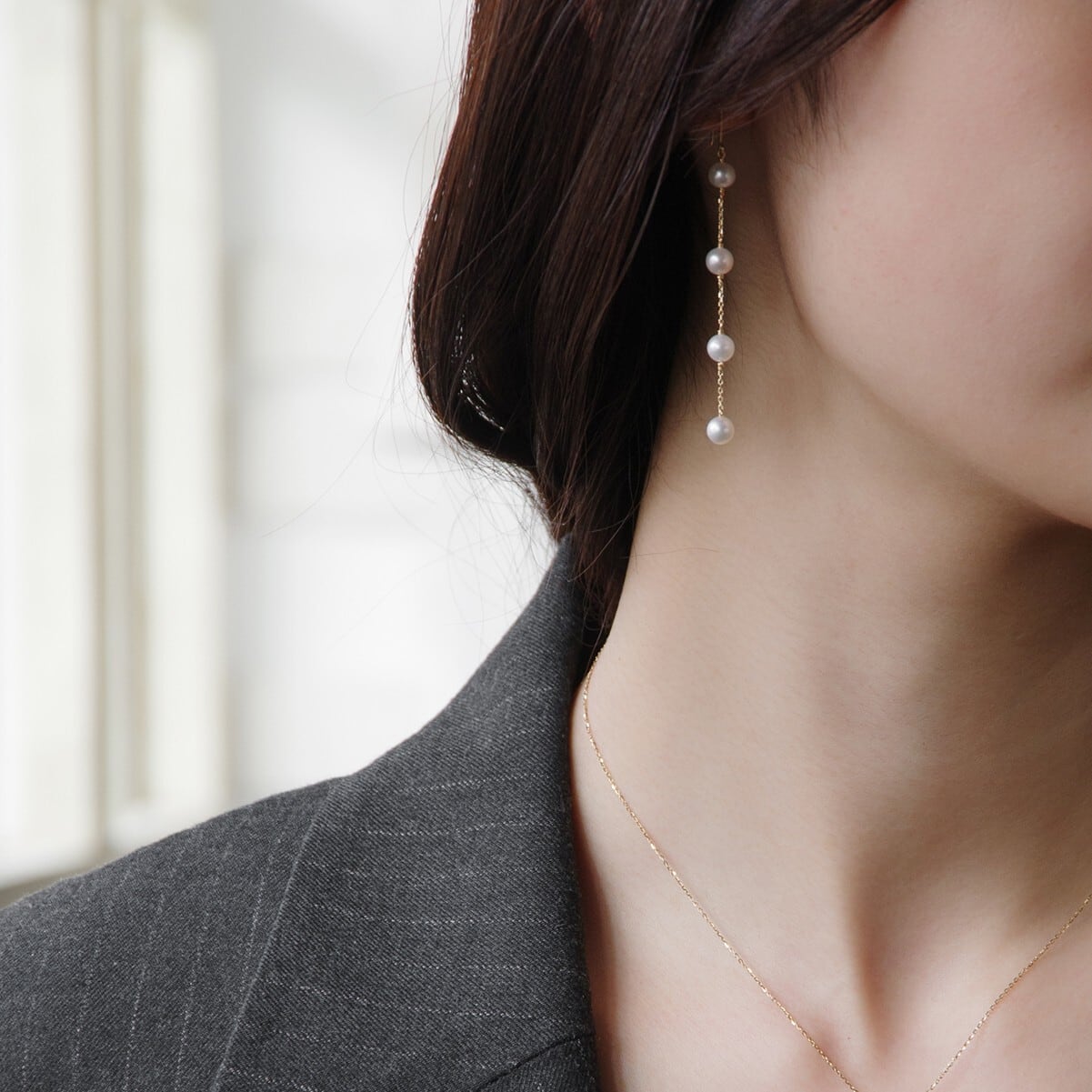 4粒の淡水パールが連なるロングピアス。優しい輝きの淡水パールがふとした仕草で揺れ、思わず目を引く印象的なアイテムです。「月のしずく」とも呼ばれるパールの幻想的な輝きをお楽しみください。