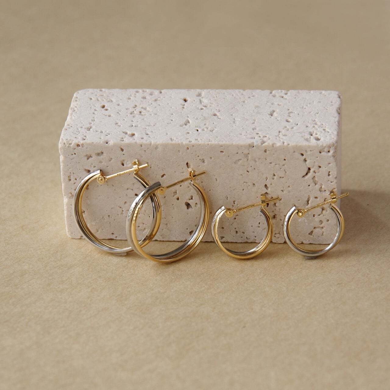 K18ゴールドとプラチナのコンビネーションフープピアス。異なる輝きを放つゴールドとプラチナをクロスさせ、コントラストが美しいデザインに仕立てました。2本のフープピアスが描く滑らかなラインは、本物の輝きを纏える華やかなアイテムです。ゴールドとプラチナ、この2つの素材が織りなす贅沢な輝きをお楽しみください。13mmサイズは、控えめに耳にそっと寄り添い、シーンを選ばずデイリーにお使いいただけます。