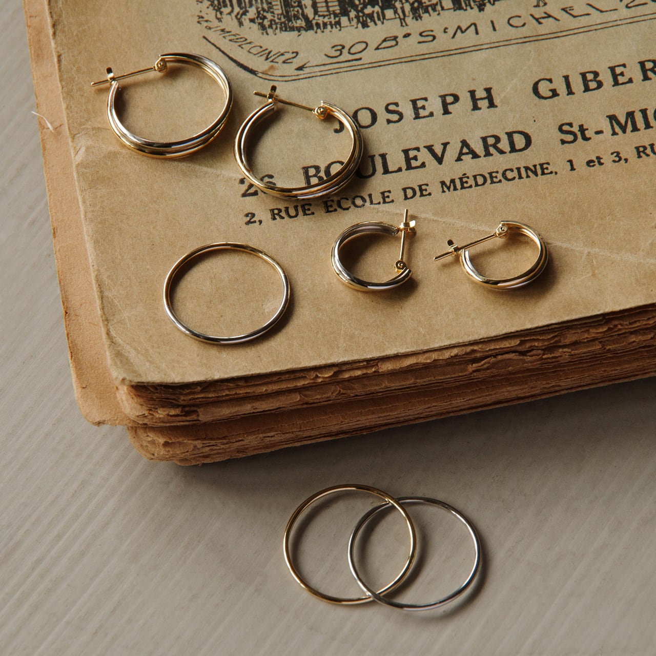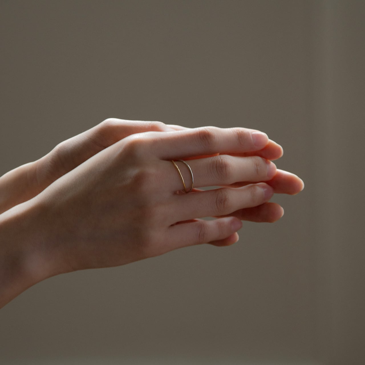 K18ゴールドとプラチナのコンビネーション 2連リング。異なる輝きを放つゴールドとプラチナのコントラストが美しいデザインに仕立てました。コンビカラーのクロスラインが、手元に華やかさをプラスします。滑らかな丸線の繊細なリングは、軽やかな着け心地でシーンを問わず、幅広いスタイルに使える万能アイテムです。ゴールドとプラチナ、この2つの素材が織りなす贅沢な輝きをお楽しみください。