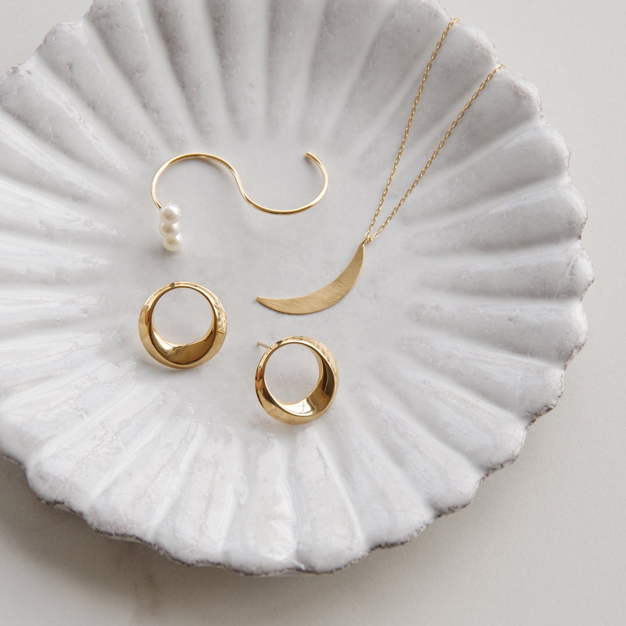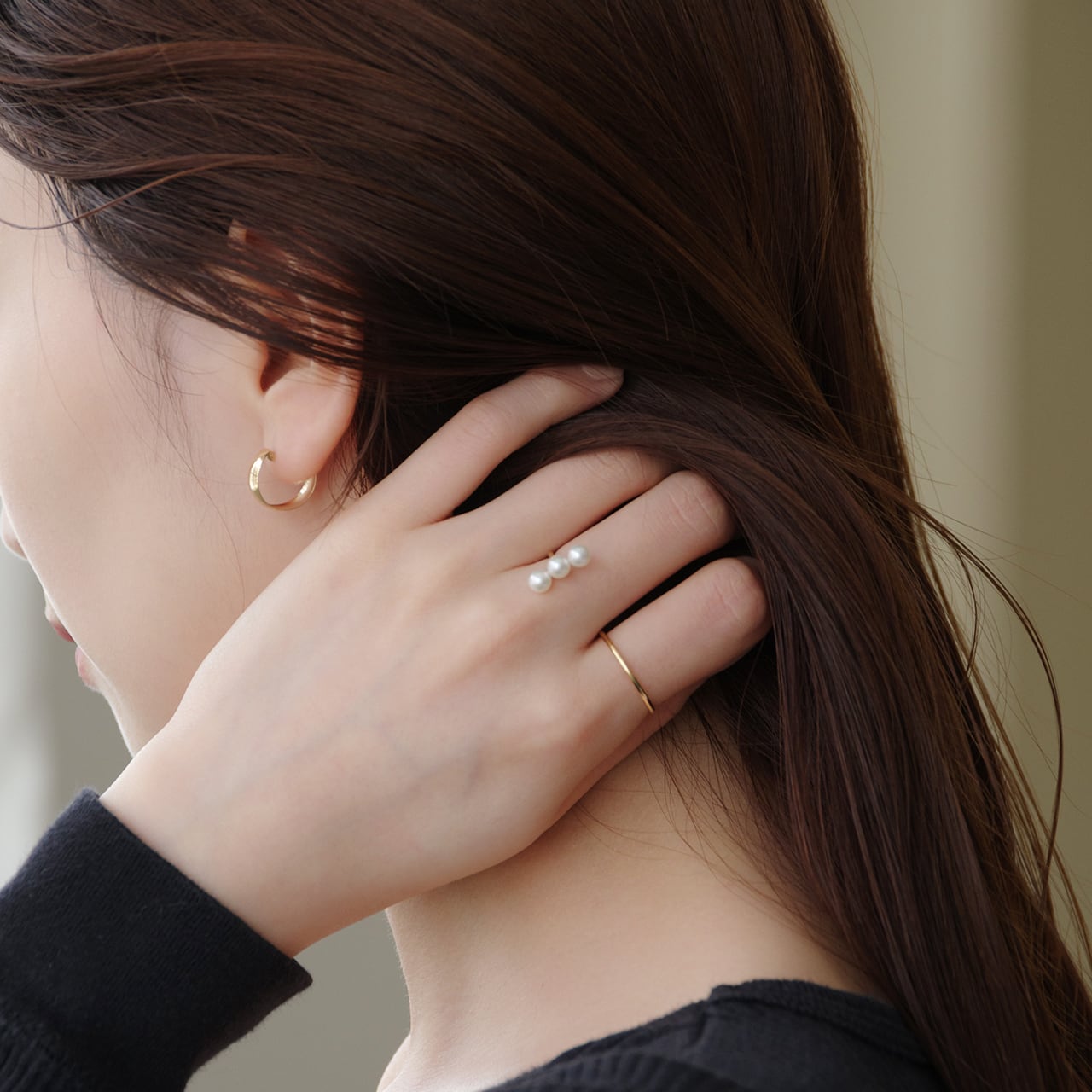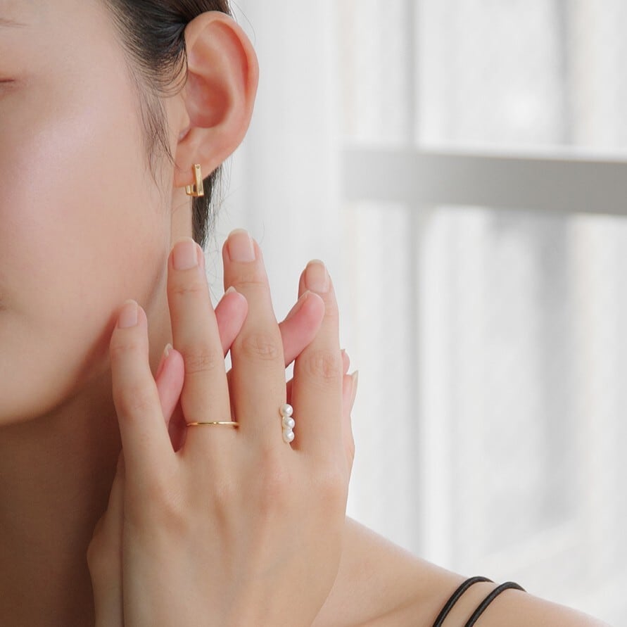 K18の艶やかなゴールドラインに、3粒の淡水パールをセッティングしたダブルフィンガーリング。隣り合った2本の指をはめる仕様のデザインは、独特なフォルムとその存在感が目を引きます。上品な淡水パールとダブルフィンガーリングのモードなシルエットが手元を華やかな印象に。カジュアルにはもちろん、オケージョンなど様々なシーンで活躍する主役級トレンドアイテムです。
