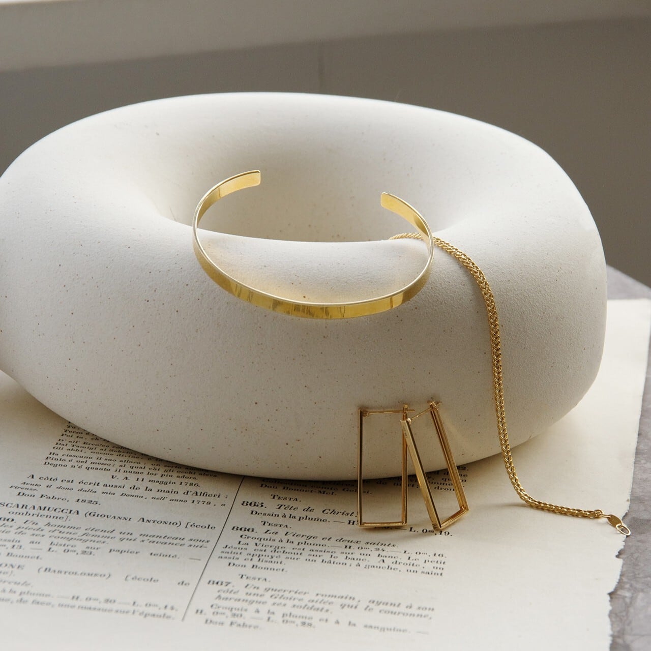 素材の魅力を最大限に生かしたK18ゴールドのバングル。腕の形に沿うよう職人が一点一点仕上げたフォルムが、手首をやさしく包み込みます。程よいボリュームとメタリックな質感が、カジュアルにもフォーマルにも映えるデザイン。K18の上質な輝きが、大人の洗練された美しさを引き立てます。単品使いはもちろん、時計やブレスレットとの重ね着けもおすすめです。