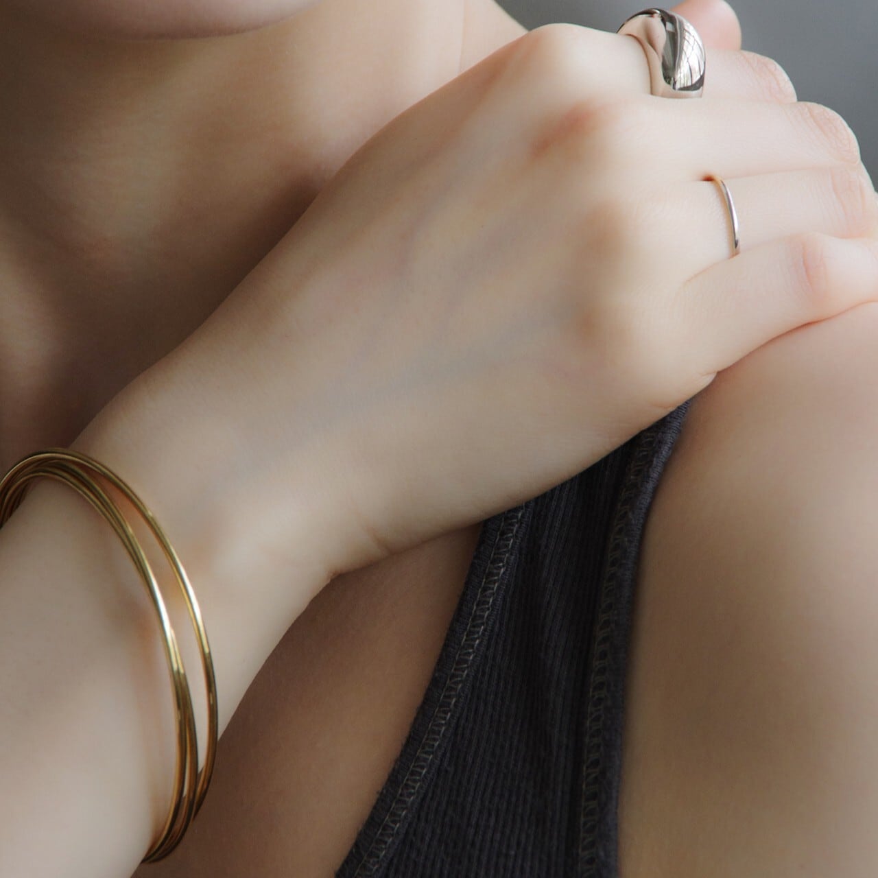 凛とした輝きが印象的なK18ゴールドの3連バングル。妥協のない仕上げにこだわり、贅沢にK18を用いてボリューム感のあるデザインに仕立てました。K18の存在感と滑らかなフープフォルムが、手首を美しく、洗練された印象に導きます。程よい抜け感がスタイルにアクセントを添え、装いにスタイリッシュな華やかさをプラス。職人の繊細な手仕事と、素材が持つ本来の美しさが響き合う、特別な逸品をぜひご堪能ください。