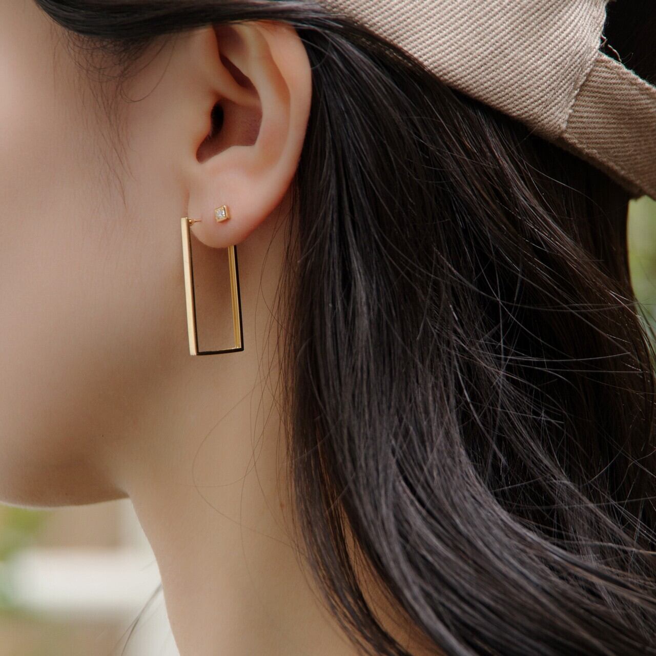 スクエアが本来持つ造形美にインスパイアされた、K18YGのレクタングルフープピアス。建築や構造物でも多く使用される長方形。見ている側に力強さや信頼感を与え、無駄のないミニマムさが性別を問わず愛されています。エッジの効いた洗練されたデザインは、お顏まわりにスタイリッシュな印象を添え、品の良さをプラス。クールなフォルムと、艶やかなK18の輝きが、ハイセンスなコーディネートへと導きます。程よいボリューム感とシンプルさが融合した、MONICEならではの新感覚な”四角形”の魅力を、ぜひお楽しみください。