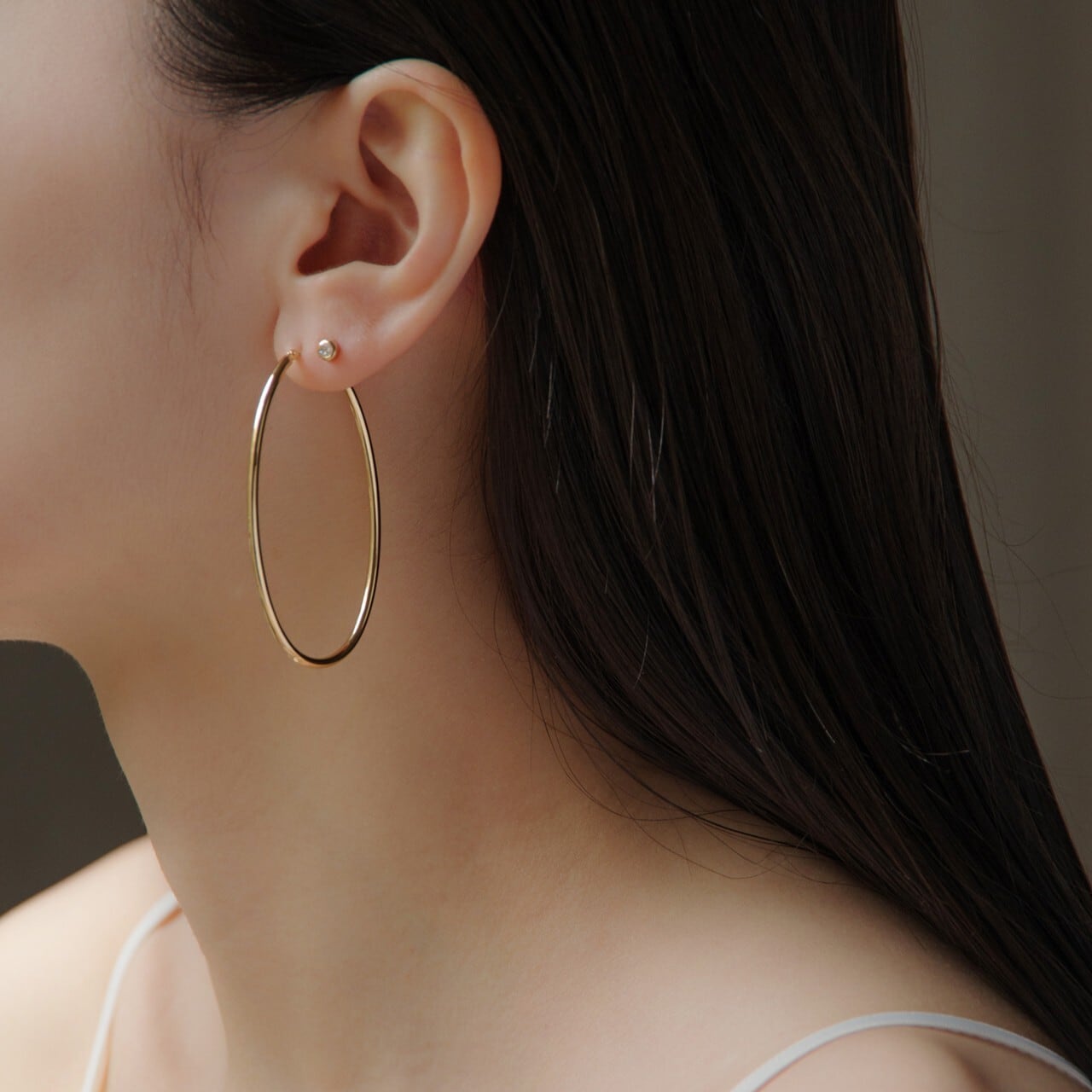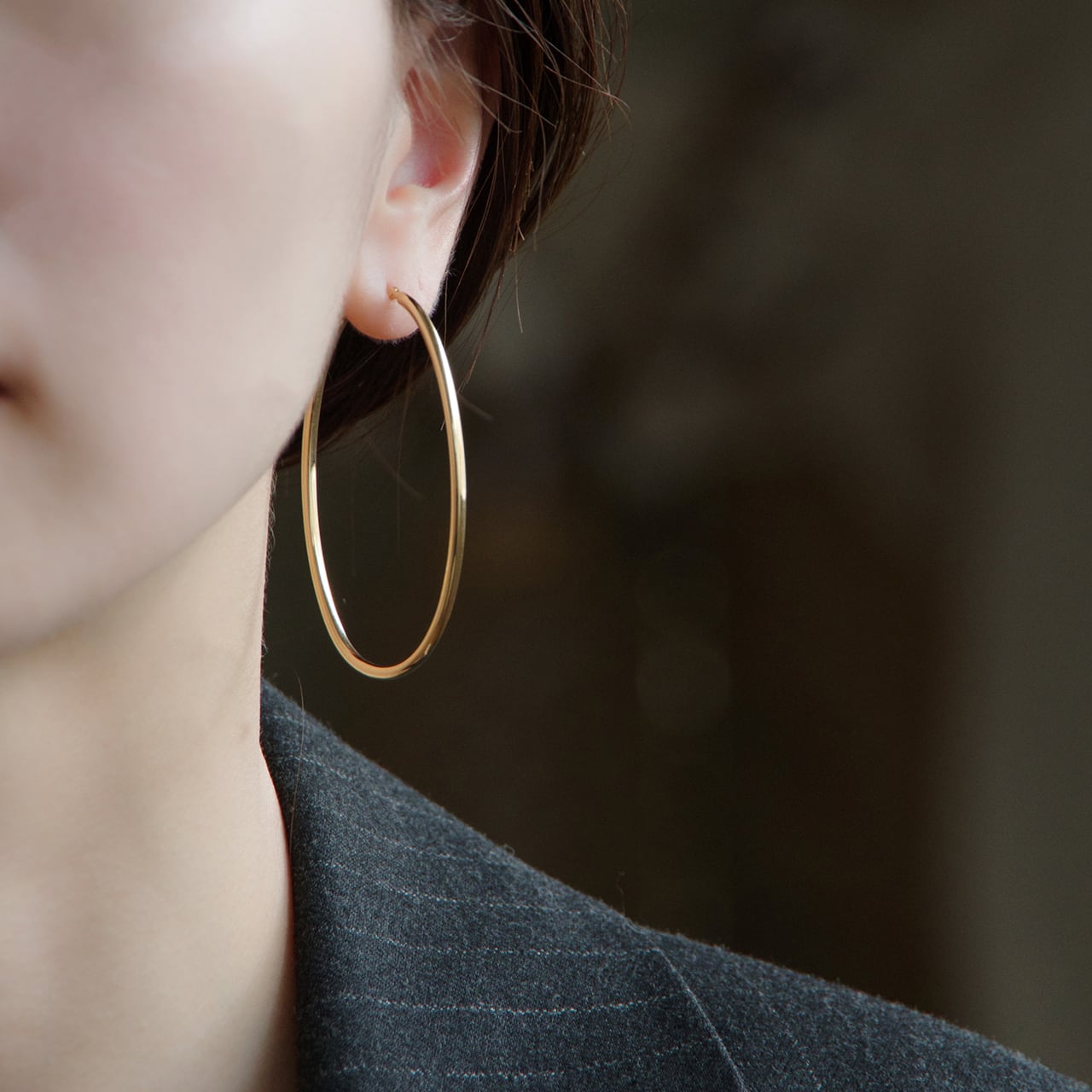 スタイリッシュで、無駄を省いた美しさが魅力のK18オーバルフープピアス。モダンなデザインはコーディネートのアクセントとなり、お顏まわりを華やかに魅せてくれます。K18でお仕立てしたオーバルフォルムの曲線美は、洗練された印象で時を経ても愛され続けるデザインです。小顔効果のある大ぶりフープは、ボリュームがありながら軽やかな着け心地が魅力。シンプルだからこそ際立つ本物の輝きをお楽しみください。